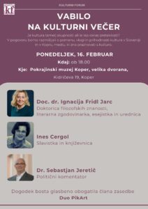 Prisrčno vas vabimo na kulturni večer, posvečen razmisleku o vlogi, pomenu in prihodnosti kulture v Sloveniji ter v našem prostoru.