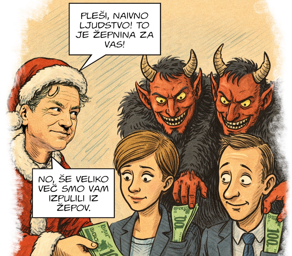No, našemu premierju se za zdaj ni treba bati – pred ljudmi nastopa kot sv. Nikolaj in Božiček hkrati, tako kot je to menda počel Titej, ki nam je vse dal (tudi to, kar nam je vzel), celo lastno nogo in po novem še glavo. Obljublja božičnice in še udeležbe pri dobičku, ljudje pa so že od tega dovolj siti. No, seveda se Robi in Zoki na odru nekako nista mogla dogovoriti, kdo je Miklavž in kdo parkelj, tako da je bilo na tisti fešti ljubljanskega holdinga kar nekaj zmede, ker niti Božiček niti dedek Mraz ob sebi nimata peklenščkov.