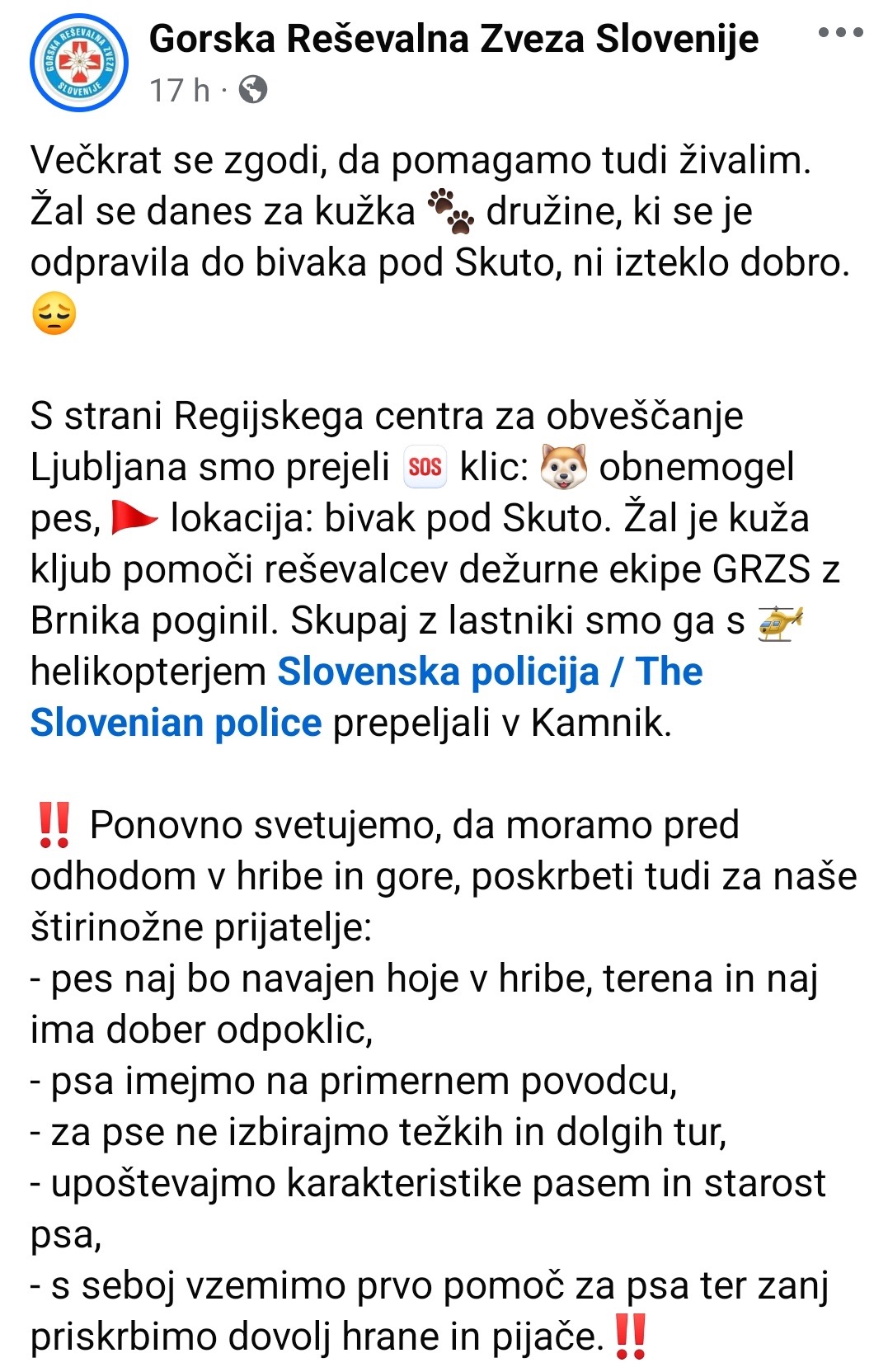 “S strani Regijskega centra za obveščanje Ljubljana smo prejeli klic: obnemogel pes, lokacija: bivak pod Skuto. Žal je kuža kljub pomoči reševalcev dežurne ekipe GRZS z Brnika poginil. Skupaj z lastniki smo ga s helikopterjem Slovenska policije prepeljali v Kamnik,” je na facebooku zapisala Gorska reševalna zveza Slovenije.