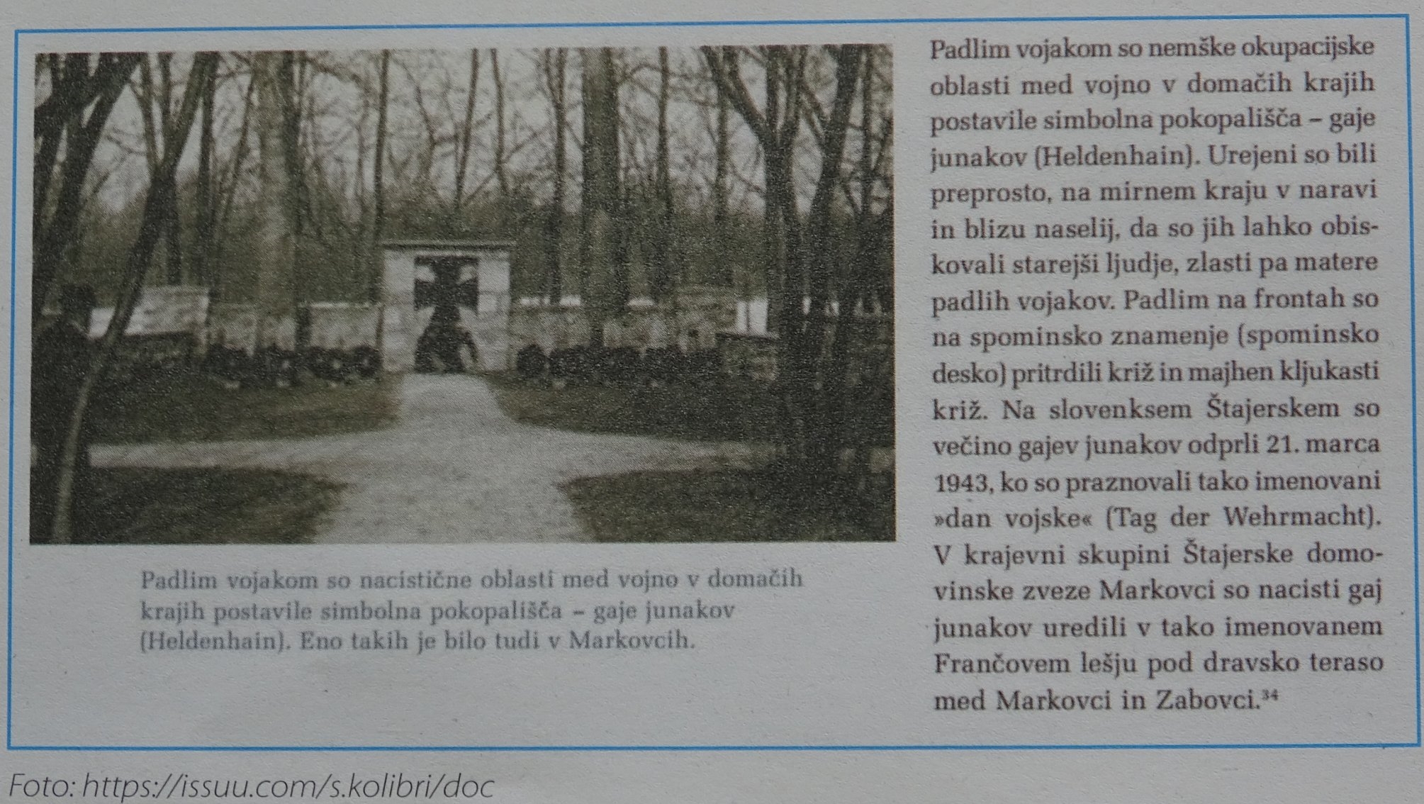 Kot piše v članku, so Nemci za takšna majhna grobišča uredili t. i. gaje junakov na mirnem kraju izven naselij, da so jih lahko obiskovali starejši ljudje in zlasti matere padlih vojakov. Večino teh gajev junakov na Štajerskem so odprli 21. marca 1943, ko je bil t. i. dan vojske. Tako so tisti dan odprli takšno obeležje tudi med Markovci in Zabovci.
