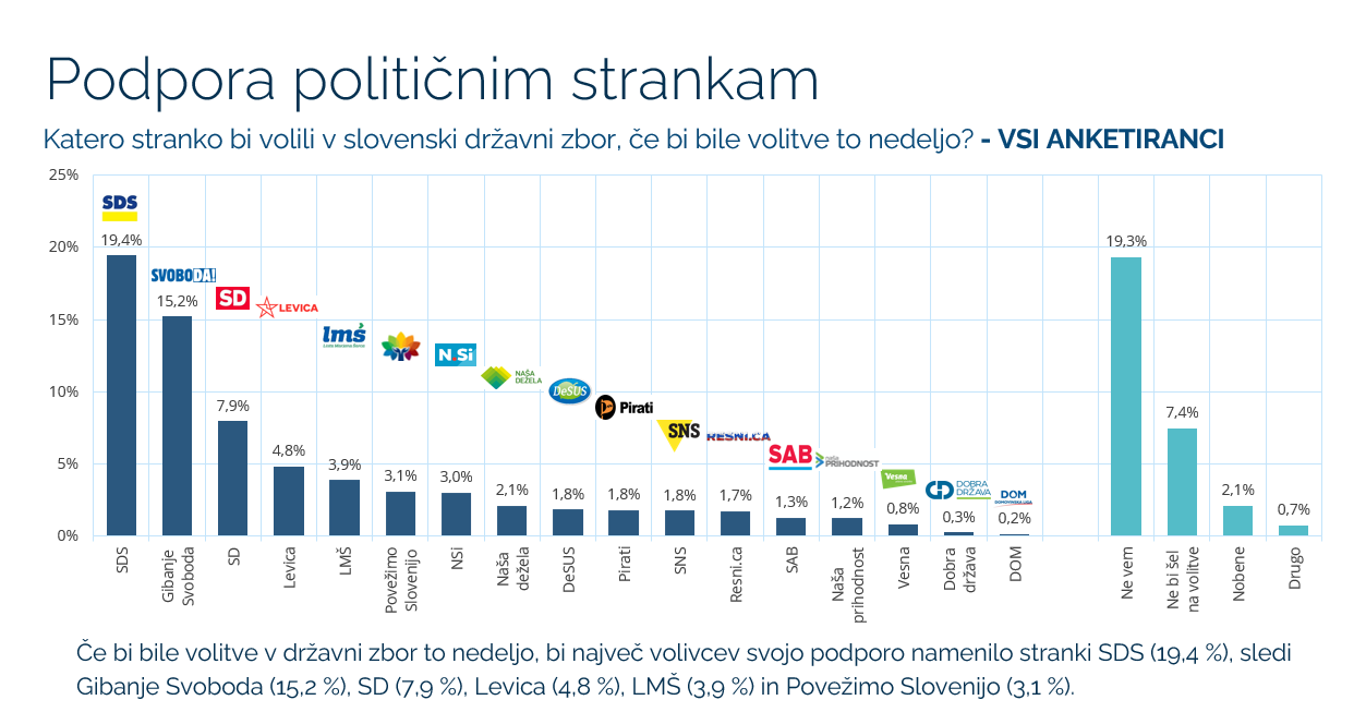 Če bi bile volitve v državni zbor to nedeljo, bi največ volivcev svojo podporo namenilo stranki SDS (19,4 odstotka), sledi Gibanje Svoboda (15,2 odstotka) in SD (7,9 odstotka). Med opredeljenimi bi SDS dobila 27,6 odstotka, Gibanje Svoboda 21,6 odstotka in SD 11,3 odstotka. Sodeč po anketi v vzorec, v katerega so zajeti le opredeljeni (n=549), je videti, da bi čez parlamentarni prag uspelo priti tudi strankam Levica (6,9 odstotka), LMŠ (5,5 odstotka), Povežimo Slovenijo (4,4 odstotka) in NSi (4,3 odstotka).