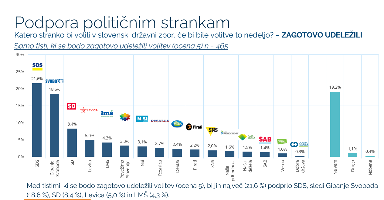 Podobno stanje je pri tistih, ki bi se volitev zagotovo udeležili (n=465) – SDS bi dobil 21,6 odstotno podporo, Sledi Gibanje Svoboda z 18,6 odstotno podporo in stranka SD, ki bi prejela 8,4 odstotno podporo. Parlamentarni prag bi prestopili tudi v stranki Levica (5 odstotkov) in v stranki LMŠ (4,4 odstotka). Stranki Povežimo Slovenijo in NSi ne bi dobili dovolj podpore, čez 19 odstotkov pa je bilo takih anketirancev, ki niso vedeli, komu bi oddali svoj glas.