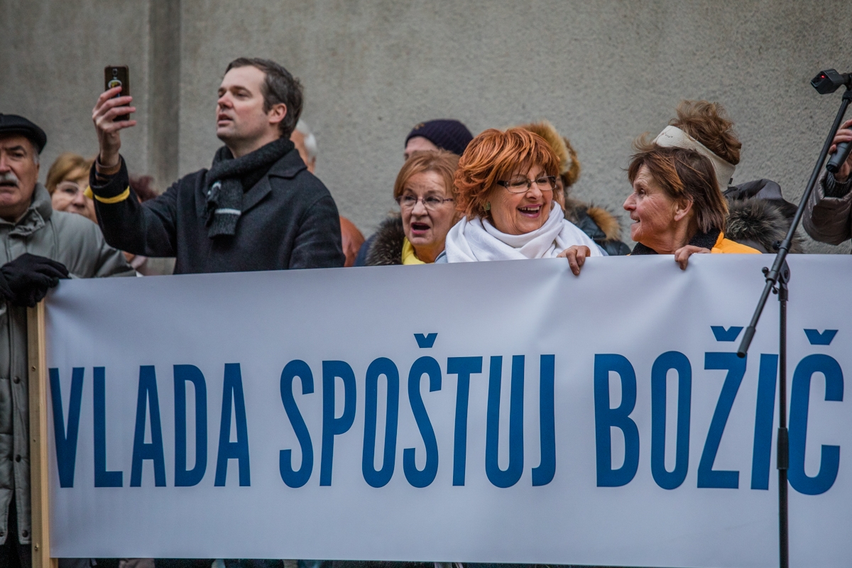 “Jernej, sram naj te bo”, “Božiča ne damo”, “Nismo umazane živali”, “Božič=mir, vlada=nemir”, “Vlada, spoštuj Božič in svoje ljudi” so sporočali transparenti na današnjem protestu pred vlado, kjer je množica od predsednika vlade Marjana Šarca zahtevala odstop državnega sekretarja na ministrstvu za izobraževanje in šport Jerneja Štromajerja. “Človek, ki izjavlja tako nespoštljive besede, ne more biti drugi človek vzgojnoizobraževalnega sistema v državi,” pa je prepričan vodja shoda Aleš Primc. “Kakšno sporočilo otrokom je to, da človek na taki funkciji žali ljudi zato, ker praznujejo božič?” je vprašal.