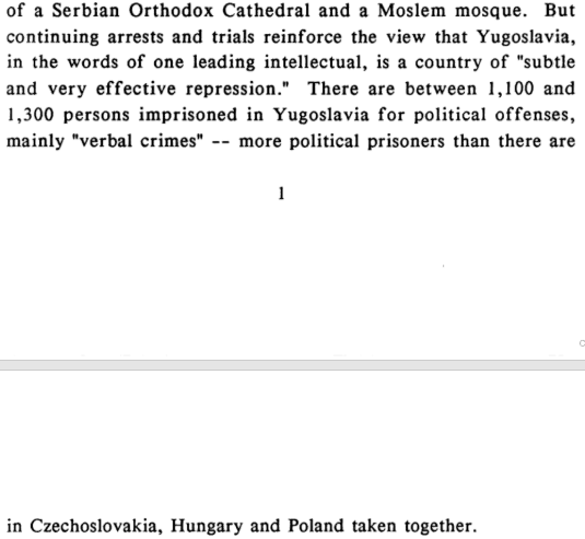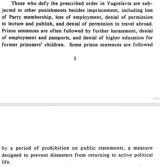 Jugoslavija je bila v določenih pogledih veliko bolj “liberalna” od preostalih komunističnih držav v Evropi, a je bila obenem tudi toliko bolj tiranska. V Jugoslaviji je bilo v času nastajanja omenjenega poročila zaprtih od 1.100 do 1.300 političnih zapornikov. Večina zaradi tako imenovanih “verbalnih deliktov”. To je “več političnih zapornikov kot v Češkoslovaški, Madžarski in Poljski skupaj”.