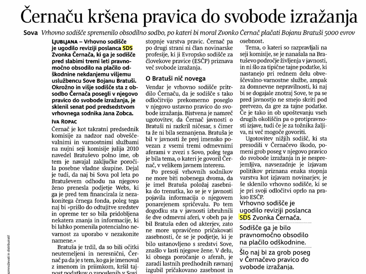 Nekdanje osrednje komunistično glasilo Delo v lasti tajkuna Stojana Petriča se je razpisalo o tem, kako je Vrhovno sodišče RS spremenilo obsodilno sodbo, na podlagi katere bi morali poslanec SDS Zvonko Černač nekdanjemu višjemu uslužbencu Sove Bojanu Bratuši plačati odškodnino v višini 5.000 evrov. Seveda pa kljub sodbi s strani najvišjega rednega sodišča v državi še vedno pišejo, da “naj bi šlo za grob poseg v pravice” Černača, nič pa o pet let trajajoči kalvariji, ki je je bil Černač deležen. “Sistemska #presstitucija biltena v lasti tajkuna,” pisanje komentira prvak SDS Janez Janša.