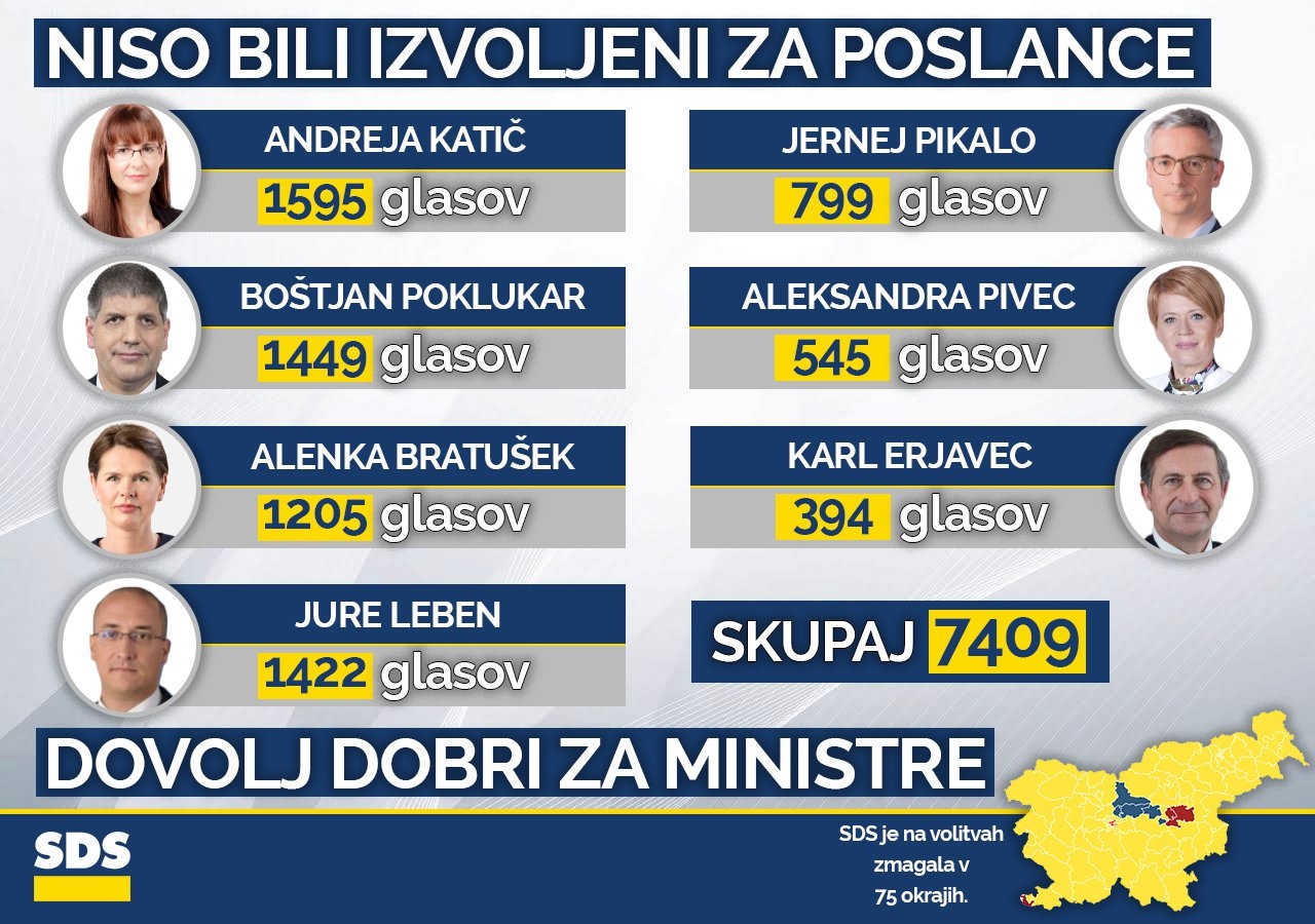 Za poslance niso bili izvoljeni niti minister za notranje zadeve Boštjan Poklukar (1.449 glasov), mag. Alenka Bratušek (1.205 glasov), Jernej Pikalo (799 glasov) in Aleksandra Pivec (545 glasov).