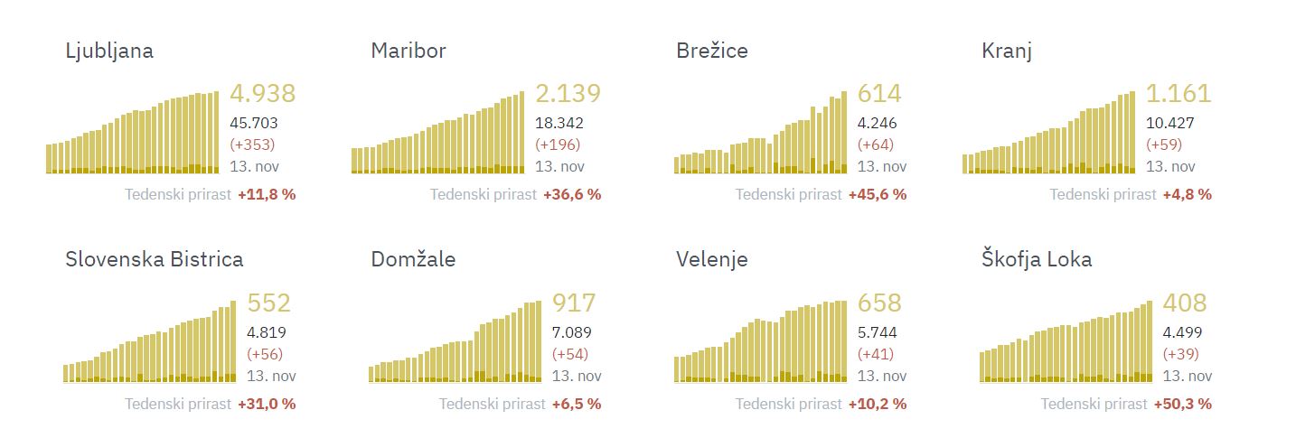 Največ okužb so zabeležili v Ljubljani. Sledili so naslednji kraji: Maribor, Brežice, Kranj, Slovenska Bistrica, Domžale, Velenje in Škofja Loka.