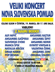 Nova24TV in Demokracija v četrtek, 19. marca, prirejata veliki koncert Nova slovenska pomlad v Celju. Z nami bodo številni znani slovenski glasbeniki in ansambli.