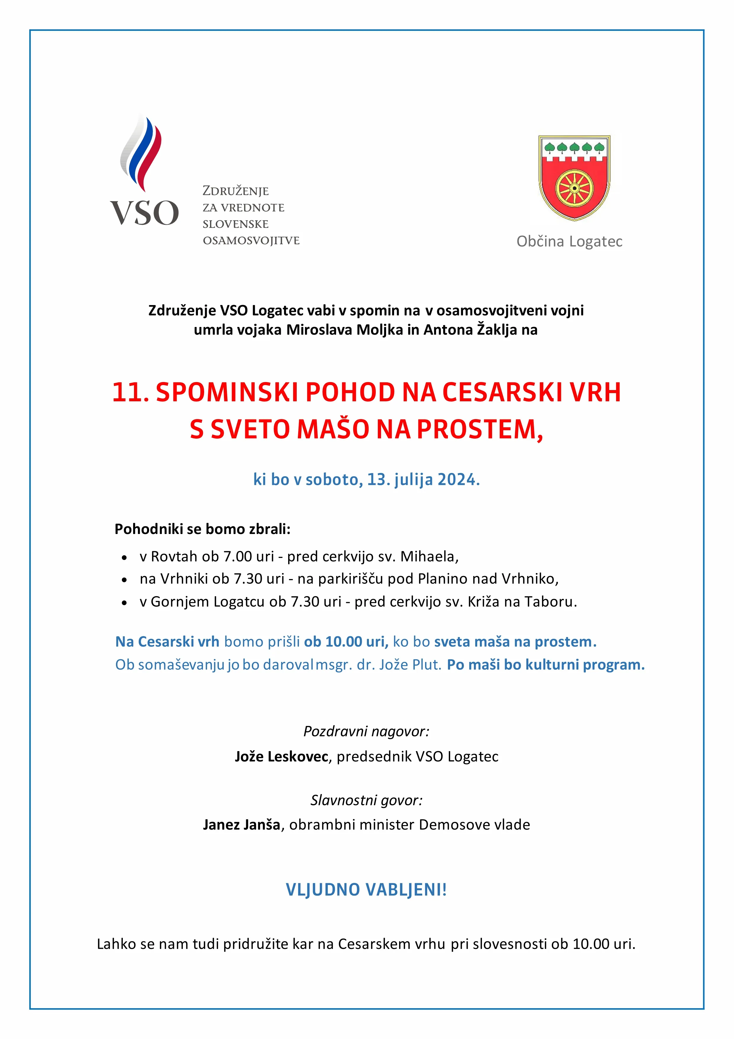 Vljudno vabljeni na 11. spominski pohod na Cesarski vrh in sveto mašo v spomin na v osamosvojitveni vojni umrla vojaka Miroslava Moljka in Antona Žaklja, ki bo v soboto, 13. julija 2024. Sveto mašo bo vodil msgr. dr. Jože Plut, slavnostni govornik bo Janez Janša.