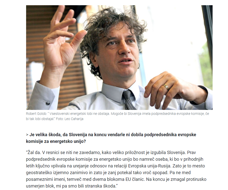 Kot že rečeno, je Golob v intervjuju leta 2014 obžaloval, da Sloveniji niso dodelili energetskega resorja, saj je upal, da bo Slovenija s svojo prorusko usmerjenostjo lahko vzpostavila prijateljske odnose med Evropsko unijo in Rusijo. “V resnici se niti ne zavedamo, koliko priložnosti je Slovenija izgubila. Podpredsednik Evropske komisije za energetsko unijo bo oseba, ki bo v prihodnjih letih ključno vplivala na urejanje odnosov med Evropsko unijo in Rusijo,” je dejal in pojasnil, da je zato to mesto geostrateško izjemno zanimivo. “Pa ne med posameznimi imeni, ampak med dvema blokoma članic EU. Na koncu je zmagal protiruski blok, mi pa smo bili stranska škoda,” je še dejal elektro-oligarh, ki je v tistem času še trdil, da si ne želi postati predsednik vlade. V Demokraciji so zapisali, da je Golob torej obžaloval, da sestava Evropske komisije ni bila proruska.