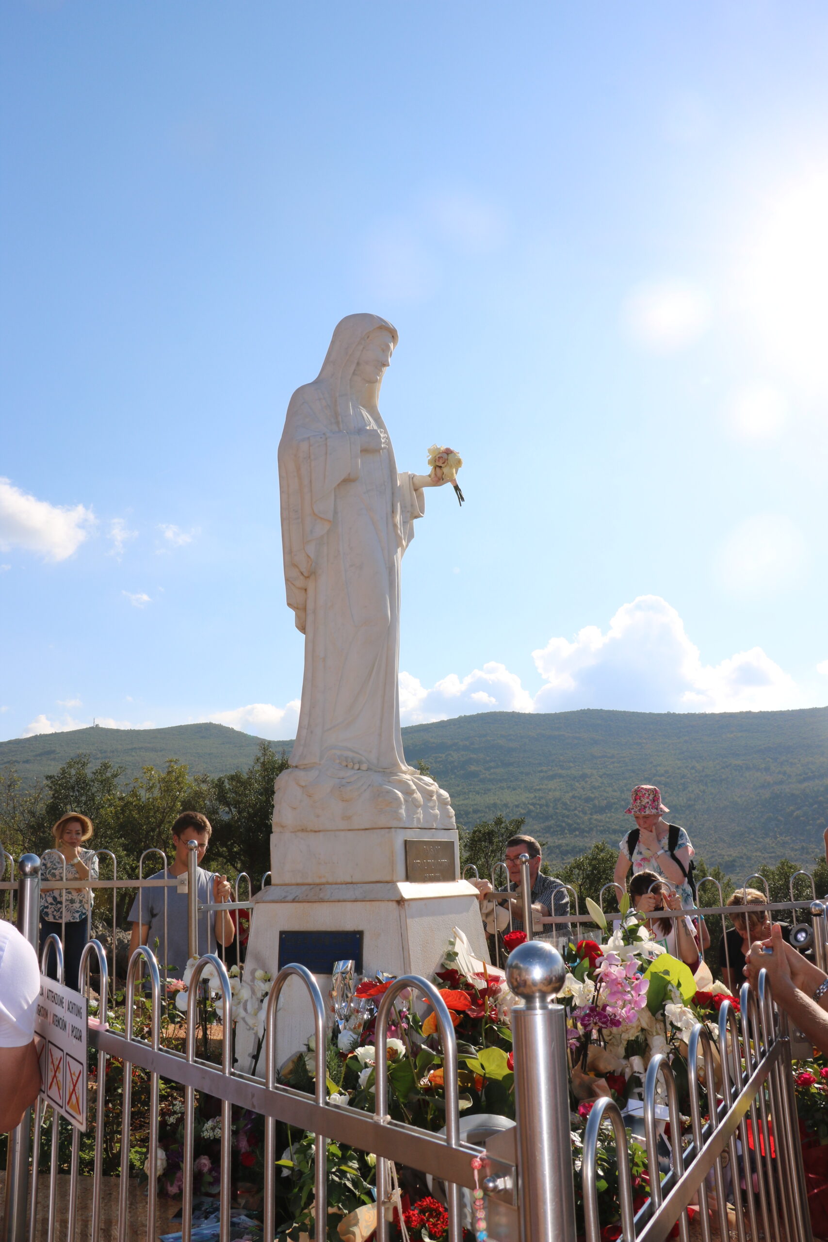 Naša pot v Medžugorje je z vsemi postanki vred pravzaprav trajala »samo« deset ur. Na avtocesto smo se vključili na hrvaški strani (Đurmanec, nekaj kilometrov vzhodno od Rogatca), od tem vodi avtocesta praktično vse do Medžugorja, seveda mimo Zagreba, Zadra, Šibenika, Splita, nato pa se pri Pločah spet usmeri proti severu. Seveda je vmes zoprna bariera: mejni prehod, ki naznanja, da zapuščamo Evropsko unijo in schengensko območje. Ker pa pred nami ni bilo nobenega avtobusa, so bile mejne formalnosti zelo hitro opravljene, tako da smo postavili pravi rekord pri potovanju. Kosilo smo imeli v našem penzionu – gre za gostitelja, ki sprejema Slovence od časov, ko je romarske skupine tja vodila sedaj pokojna Maja Zalar – napovedano ob 14. uri, a prišli smo eno uro »prezgodaj«. Se zgodi. Vseeno so imeli obroke pripravljene in smo lahko na kosilo odšli že prej, nato pa na našo prvo molitveno misijo: Hrib prikazovanj. Tam se je Marija prvič prikazala že 24. junija 1981, dan kasneje pa je šesterica najstnikov, štiri dekleta in dva fanta, najmlajši je imel 11 let, najstarejša pa 17, prvič spregovorila z »Góspo«, kot jo tam imenujejo. Zato je 25. junij vsako leto tudi obletnica prikazovanj. Tam je že v prvih dneh dala svoje prvo sporočilo, da mora zavladati mir med Bogom in človekom ter med ljudmi. Deset let po tem so sledili razpad Jugoslavije, Slovenija se je osamosvojila, Hercegovino, v kateri je Medžugorje, pa so že takrat obdajali črni oblaki: velika kolona oklepnikov JLA je iz Mostarja krenila proti Kninu, Sinju in Splitu, goloroki prebivalci pa so jo ustavili. Kakorkoli že, na tem kraju smo zmolili rožni venec in se za nekaj časa ustavili pri Marijinem kipu na kraju prikazovanj. Na tem mestu naj bi se pojavilo znamenje, ki sodi v eno od desetih medžugorskih skrivnosti. Bilo naj bi neuničljivo in bo takoj jasno, da ni delo človeških rok. Kdaj se bo pojavilo in kakšno bo, ni znano. Ostaja skrivnost.