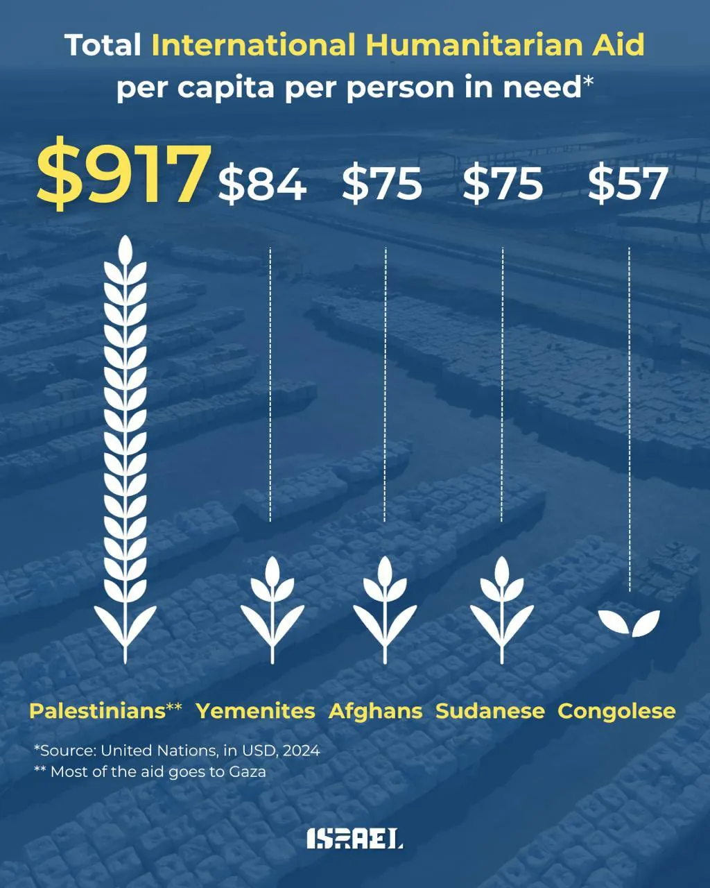 Statistika je pokazala, da so Palestinci prejeli med 10-krat in 35-krat več humanitarne pomoči kot prebivalci Jemna, Sudana in Konga kljub izjemno hudi humanitarni krizi v teh državah. Objava, podkrepljena s podatki in grafično primerjavo, izpostavlja očitno neenakomerno porazdelitev mednarodne pomoči.