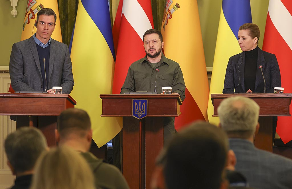Ukrajinski predsednik Volodimir Zelensky je na skupni tiskovni konferenci s premierom Španije Pedrom Sánchezom in danske Mette Frederiksen izjavil, da Ukrajina skuša deblokirati mesto Mariupol na vojaški in diplomatski način.